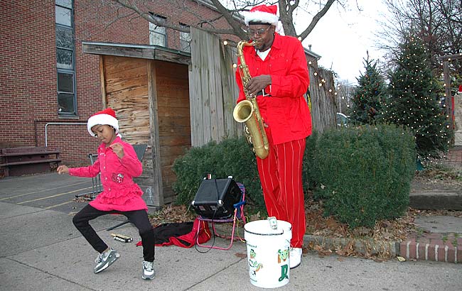 Dayton musician Tumust Allison and his daughter, Angel, added to the holiday spirit last weekend in downtown Yellow Springs. A former villager, Allison is leader of the music group Serious Young Musicians, a performer, educator and private teacher.