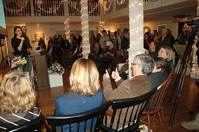 Several hundred people from the Antioch College and Yellow Springs community gathered last Thursday at Herndon Gallery to honor outgoing president Mark Roosevelt and his wife, Dorothy. A variety of speakers, including villagers, college students and staff, roasted and toasted Roosevelt.