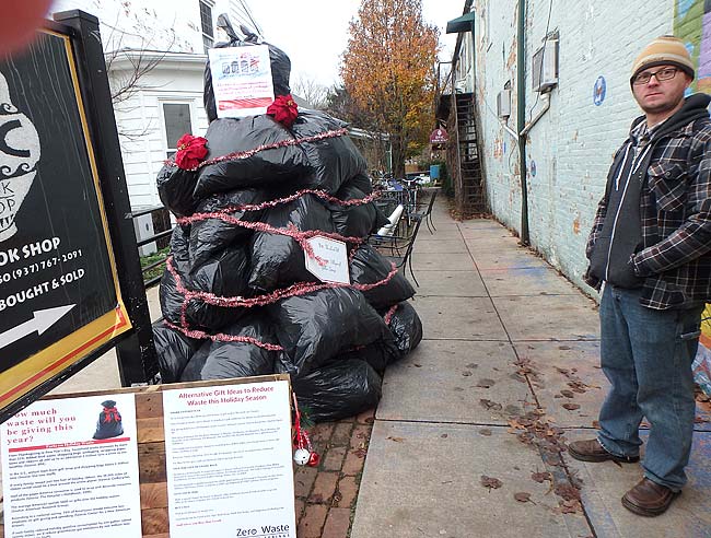 Tom Clevenger, a member of Zero Waste Yellow Springs, a group affiliated with the YS Resilience Network, stands next to the “Trash Tree” they created to raise awareness around issues of consumption and waste during the holidays. The tree, made of trash bags stuffed with newspaper, proved surprisingly controversial. Erected in the alley next to the Emporium, it was up for just four days last week; it was damaged and, ultimately, dismantled before group members took the remainder of the tree down last Thursday. (submitted photo)