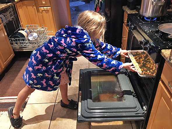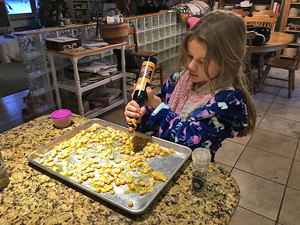 We got up early and I set her up with a can of chickpeas and a can opener. Piercing the metal top, I showed her where to stop so that we could use the can to drain the liquid from the chickpeas but just setting their can upside down. While she worked the can opener, I got out a sheet pan and set the oven to 400 degrees. We spread the chickpeas across the cooking surface, and my daughter dosed them with salt, pepper, and the agrumato. I tossed the chickpeas to coat them well then we loaded the pan into the preheated oven.