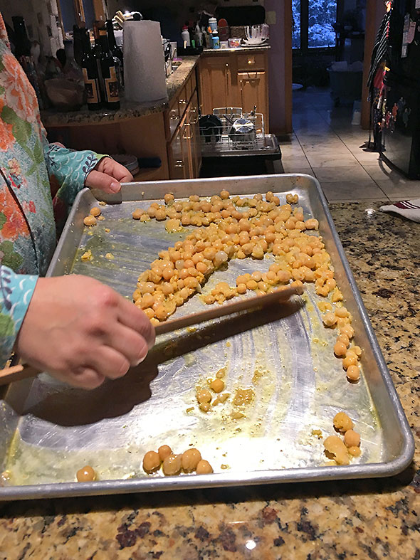 As we dressed for the day, we could smell the toasting chickpeas…both the peas’ nuttiness and the perfume of citrus and olive from the oil. We took the pan from the oven after 20 minutes with the chickpeas bubbling hot and crispy.