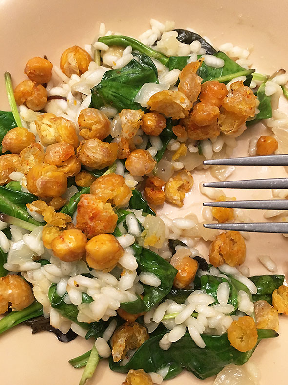 On top of the risotto, we placed crispy spicy chickpeas. I had made these treats earlier in the day and almost had to hide them. They proved a delicious snack and my daughter wondered aloud if she might be able to take some to school with her the next day. Since the risotto did not survive dinner, I offered to make another batch of chickpeas with her the next morning.