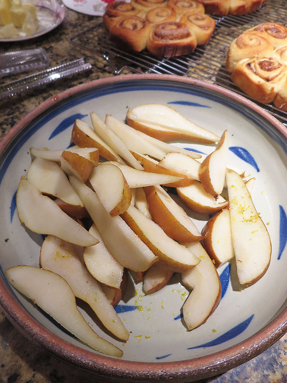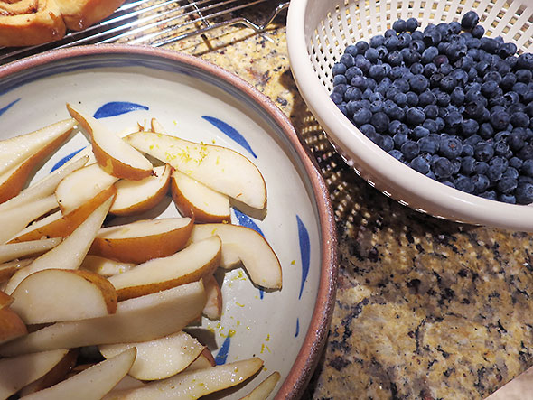 We are going to a dinner party and have promised to bring pie. The evening before, we prepare the filling. First, we cleave two pears with an apple slicer and an orange about its waist. The pear slices get a bath of orange juice squeezed from one half and then a generous sprinkling of orange zest. We combine the pear slices with two pints of blueberries and a pint of dried plums…enough fruit to fill two pies easily.