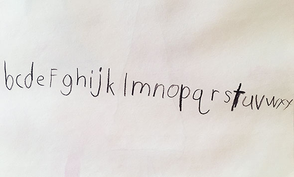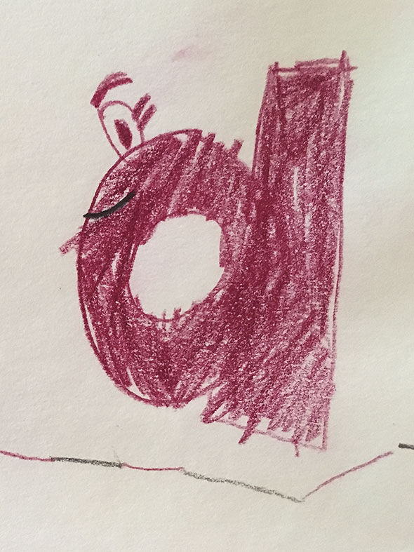 Our re-imagined alphabet had a humble start. My daughter and I came up with the idea early last year. Our intent was to contruct a memorable story that would guide my daughter in her handwriting. She often flipped letters—like b and d or p and q—and would run into delays as she stopped to erase and redraw printed letters in their proper orientation. We crafted a story that would keep the correct orientation of each letter forward in her mind and introduce the skill of reading words by shape. We put the first four lines together and sent them to my friend Valerie Rieker to illustrate.