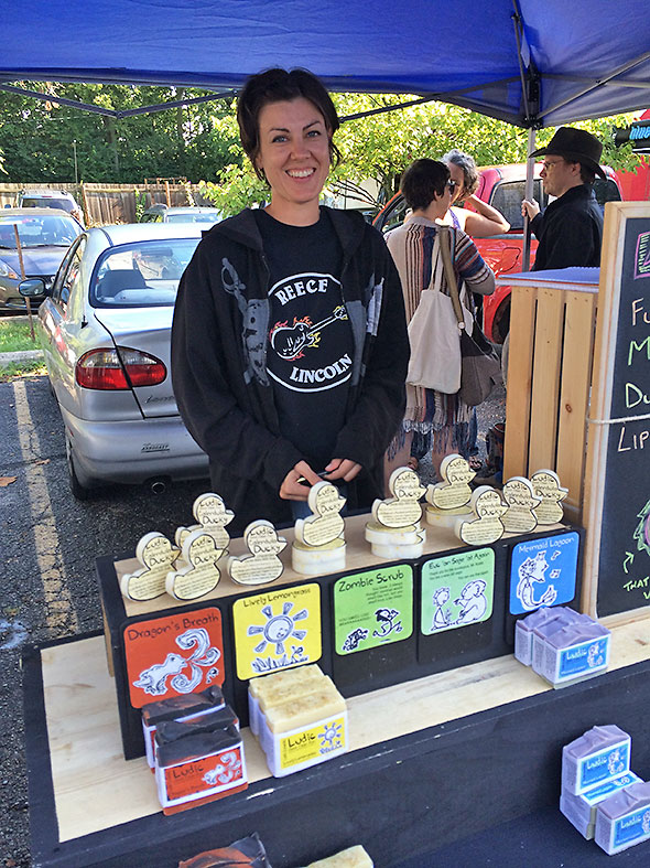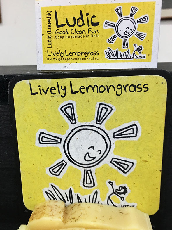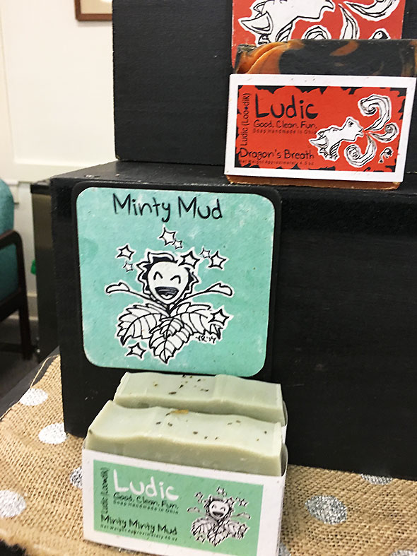 I know Rieker from the Winter Farmers Market. She’s the owner and creative force behind Ludic Soap. Rieker handcrafts her products from lye and essential oils. She also designs her product labels. Her illustrations caught my eye when she first arrived at the winter market last January. The soothing effects of her soaps won my loyalty.