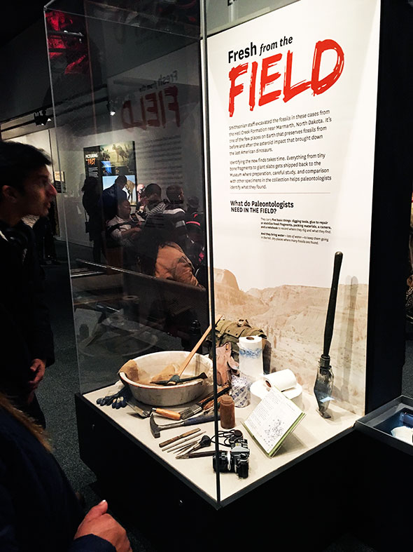 Among the most intriguing displays in more traditional museums are the ones that give reverent treatment to tools. In the National Museum of Natural History’s exhibition on the last American dinosaurs, the field tools of a paleontologist stand proudly next to the 18 foot high Tyrannosaurus Rex. Nearby, we are given a window into the FossiLab where restoration work on petrified bones and other biology are performed in full view of visitor.