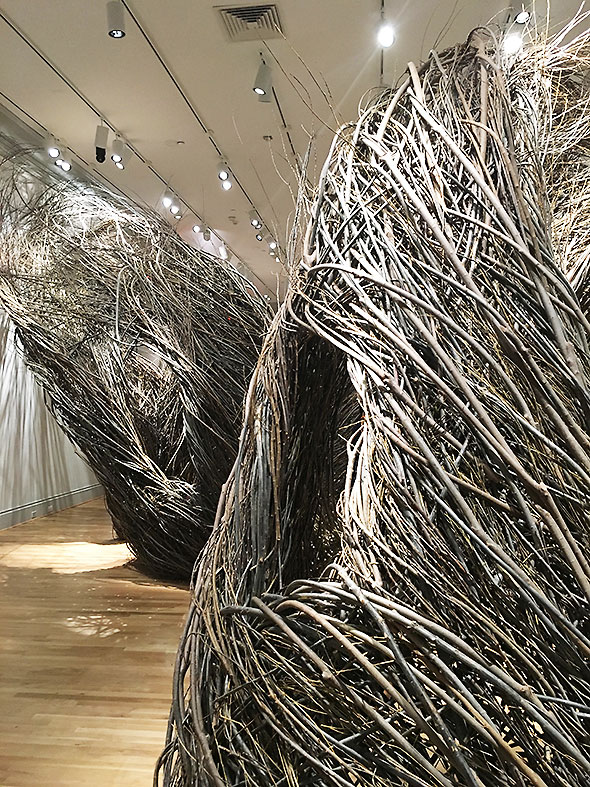 Across the mall at the National Museum of the American Indian, an interactive exhibition called the imagiNATIONS Activity Center offers young visitors to learn alternate techniques in basket weaving among other activities. Baskets hold textiles to intertwine in the cage of a basket. The basket is about the size of an average eight year old and on the scale at which young arms can easily toggle the cords back and forth through its spines.