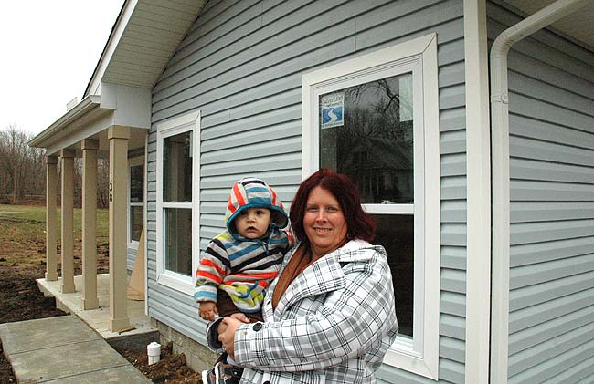 New first-time homebuyer Julie McCowan, holding her grandson, Dylann, in front of the Cemetery Street home she recently purchased through Home, Inc. for her four-person family (plus frequent visits from “little ones” like Dylann, she said). Villagers wishing to celebrate with McCowan and her family and learn more about Home, Inc.’s Cemetery Street development are invited to an open house at 138 Cemetery St. on Friday, Jan. 29, from 5 to 7 p.m. (Photo by Audrey Hackett)
