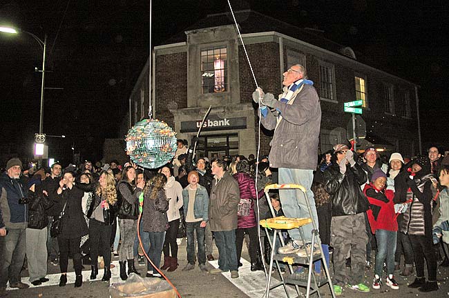 Villagers cheered as the ball dropped, then dropped again, lights flashing, at midnight on New Year’s Eve over Short Street. Lance Rudegeair operated the delicate machinery as revelers thronged downtown to ring in the new year with family, friends and fellow villagers.