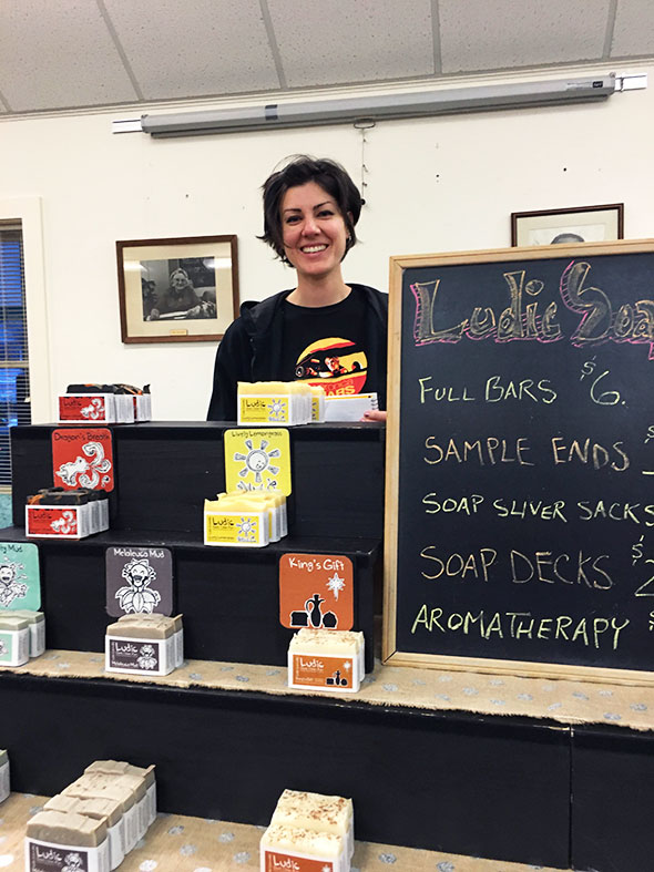 My children next visit Valerie Rieker of Ludic Soap. Rieker brings her fragrant, handcrafted soaps from Springfield OH. My daughter in particular lingers over Rieker’s diverse array of scents and colors. She finds Rieker’s display charming and points out Ludic Soap as a model vender to market newcomers.