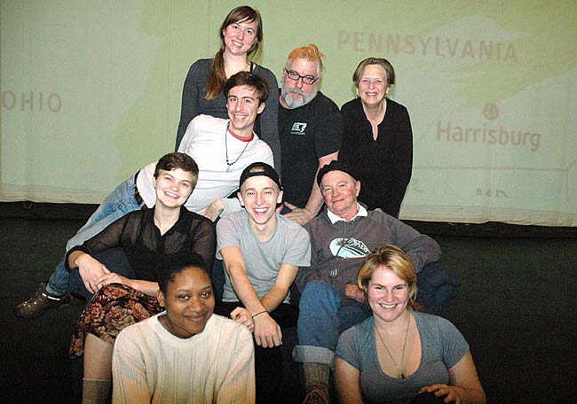 A workshop on theater improvisation and civic engagement will take place this Saturday, Feb. 13, at the Antioch College Foundry Theater from 1 to 4 p.m., led by members of The Talking Band theater company of New York City. The event is part of a monthlong project that includes the March presentation of the play “Marcellus Shale,” about the effects of fracking on a community. Shown here are cast members, from left to right, front row: Ida Lease Cummings, Parker Phelan; center row: Selena Wilkinson, Cole Gentry, John Fleming; Third row: Sean Allen; Back row: Hannah Priscilla Craig, Michael Casselli, Louise Smith. (Photo by Diane Chiddister)
