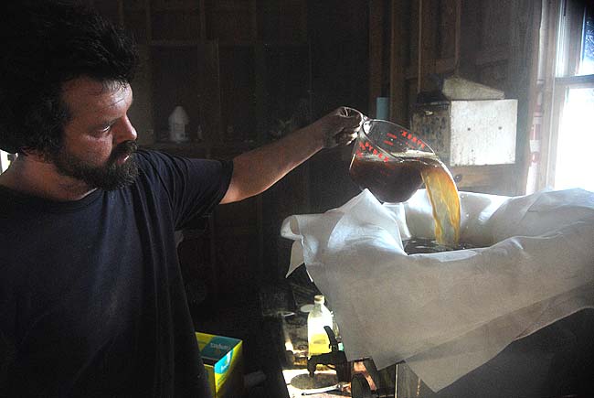 John DeWine of Flying Mouse Farms is busy these days boiling down hundreds of gallons of sap from some 650 taps of the farm’s maple trees to make maple syrup. The process requires 40 gallons of sap for every one gallon of syrup produced. The cooking takes place in the “hot house” and is fueled by a constantly burning wood stove. Above, DeWine performs one last filtration, passing the syrup through layers of thick cloth to remove any last unwanted particles.