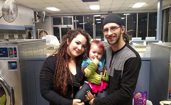 Artist Anna Burke and musician Ryan Stinson, with their daughter, Presley, 18 months, on a recent evening at the laundromat on Dayton Street. Burke and Stinson each moved to Yellow Springs in 2012 from nearby communities. They met here and have begun to build a life in the village, loving the community and navigating the challenges of housing, employment, parenthood and pursuing their art. (Photo by Dylan Taylor-Lehman)
