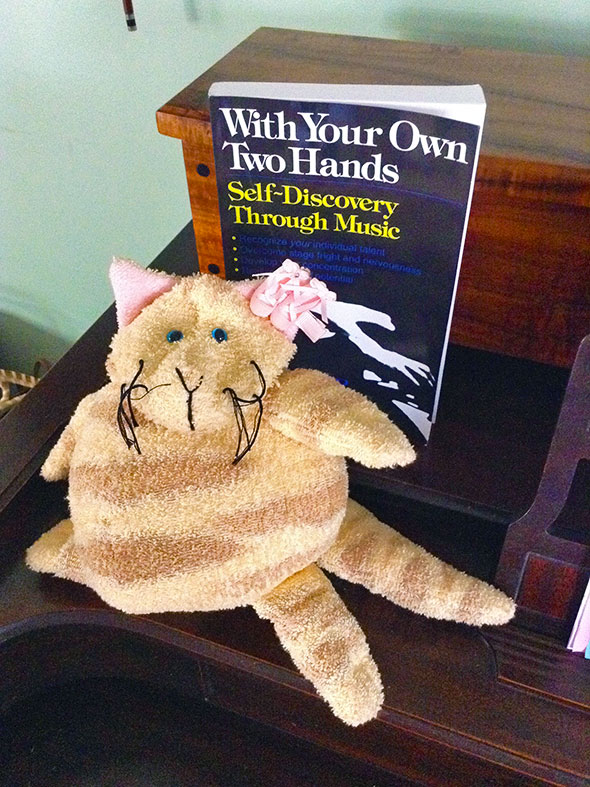 Since those early days, I’ve learned a term: Executive Function. This function refers to the internal impetus that we all need to overcome inertia and begin a task. The executive function of young person is less mature than an adult’s. Kids need more support, more stimuli, more motivation to overcome anxiety and engage. As parents and mentors, we heap supports on top of our children until we understand what proportions they need and where. Threatening to cancel lessons worked to click her executive function into functioning but knowing these threats would inevitably lead to actual cancelation, I switched tactics. I figured practice would improve if I could just motivate my daughter to keep her hands set at the piano. If we could get her to hover just above the notes where she was supposed to play, to be aware of that posture, life would improve. I found a puppet among our collection of animals, a potbelly tiger cat that I bought at a Yellow Springs street faire almost two decades ago, and called her Miss Kitty. Miss Kitty began to participate in our piano practice as a stand in for Burgess, our at-home instructor, though instead of Burgess’s Australian accent, Miss Kitty’s accent is French.