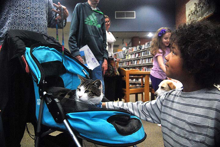 Quincy the cat crashed the party recently at the Yellow Springs Library when the library’s monthly Reading to the Dogs event took place.