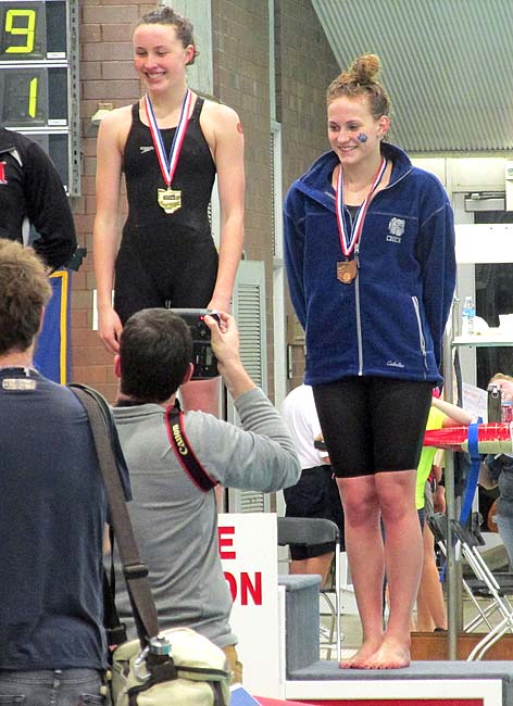 Bulldog swimmer Olivia Chick beamed proudly after receiving a bronze medal for her impressive finish in the 100 freestyle in the State Swimming Championship, held in Canton on Feb. 25 and 26. Chick and fellow Bulldog Aman Ngqakayi represented the school (and village) in the tournament, setting both school and personal records in the process. (Submitted Photo)