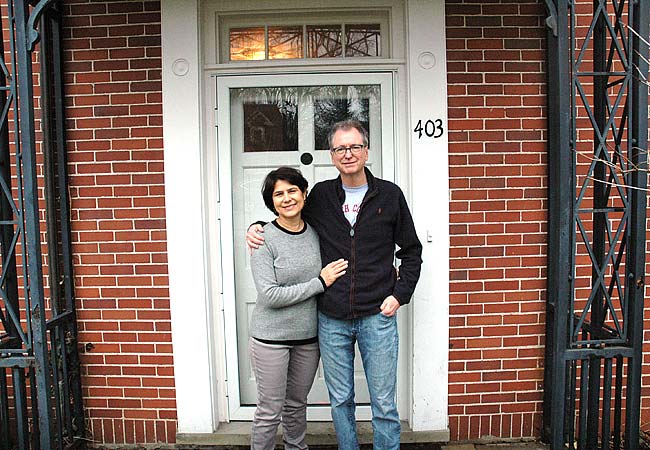 Antioch College’s new president, Tom Manley, and his wife, Susanne Hashim, stood outside their new home on Antioch’s campus, the Folkmanis House on President Street. Manley started at the college on March 1 with a full schedule of campus and community engagements; Hashim and the couple’s 11-year-old daughter, Chedin, will relocate to Yellow Springs in May. (Photo by Audrey Hackett)