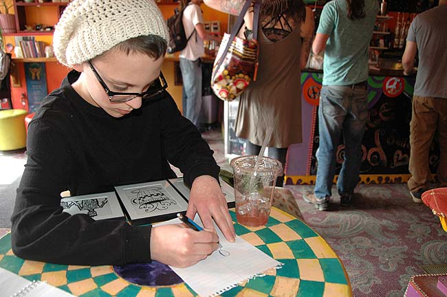 Young artist Christian Salvatore demonstrated his sketching skills at the Spirited Goat last week. On March 5 through the end of the month, the coffeehouse will host a show of his “zentangle” artwork. Pieces will be for sale (pay what you believe they’re worth) and proceeds will support Christian’s attendance at a computer coding summer camp at OSU. (Photo by Audrey Hackett)