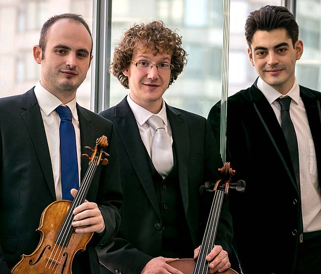 The Rolston String Quartet is graduate-quartet-in-residence at the Shepherd School of Music, Rice University, in Houston, and features Jeff Dyrda and Luri Lee on violin, Jonathan Lo on cello and Hezekiah Leung on viola. Comprised of recent graduates from the Juilliard School, New England Conservatory, Peabody Conservatory and the Glenn Gould School, the Rolston String Quartet was formed in the summer of 2013 at the Banff Centre of the Arts’ Chamber Music Residency. The quartet takes its name from Canadian violinist Thomas Rolston, the founder and longtime director of the music and sound programs at the Banff Centre. The ensemble has performed all over Canada and the United States and has worked with such contemporary composers as John Luther Adams and Brian Current. At the Yellow Springs Competition, the Rolston has chosen to play Bartok’s String Quartet No. 3, followed by Beethoven’s String Quartet Op. 59, No. 2. For its program, the Olympus Trio — made up of Regi Papa on violin, Ben Capps on cello and Konstantine Valianatos on piano — has selected Maurice Ravel’s Piano Trio in A minor; Dmitri Shostakovich’s Piano Trio No. 2 in E minor, Op. 67; and Felix Mendelssohn’s Piano Trio No. 2 in C minor, Op. 66. The Olympus Trio formed at Juilliard in 2010 and is based in New York City. The trio’s members share a passion for chamber music as well as a Hellenic heritage, and they perform a repertoire of classical masterpieces and champion the music of native Greek and Diaspora composers.In addition to teaching at Juilliard, SUNY Stony Brook and Hunter College, the trio is dedicated to reaching out to nontraditional and underprivileged members of the community through educational outreach programs. In 2013, Olympus was invited to the Greek island of Kefalonia to perform and participate in outreach for the island’s children under the auspices of the Vergottis Cultural Center. The trio’s future plans include an outreach program in fall of 2016 at St. Basil’s Academy, a program for disadvantaged children in upstate New York.