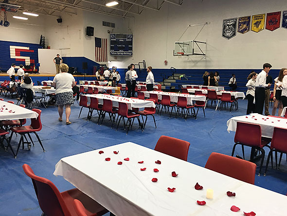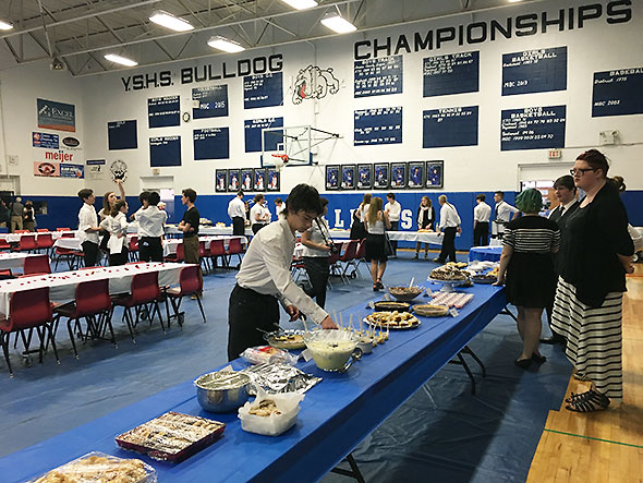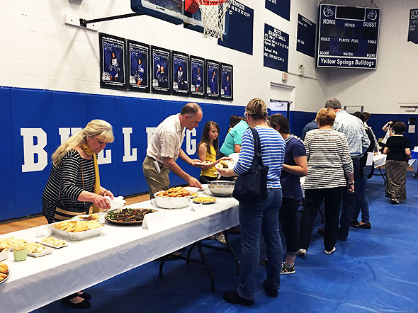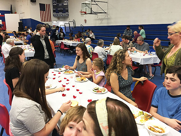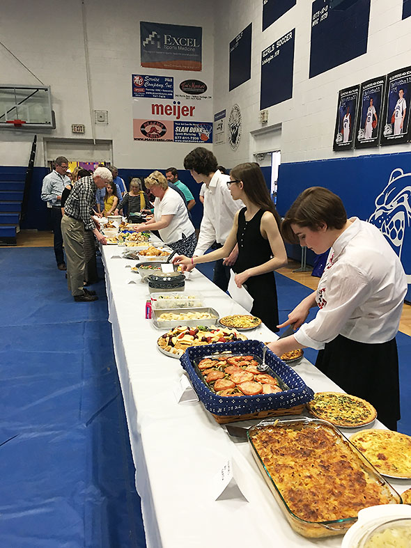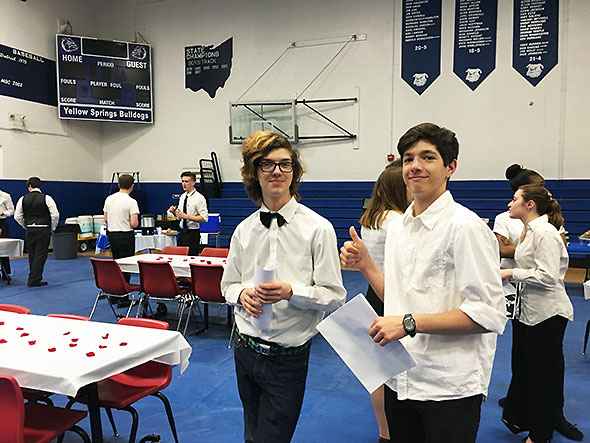 The language classes of Yellow Spring High School just came back from a nine day trip to Paris. They returned with stories, video, and a deepened appreciation for French culture. Saturday evening, the classes hosted their annual French Cafe in the high school. The event began at 5pm but the students began selling tickets a good half hour before. We arrived at 4:45pm ourselves and joined the queue already 40 people deep. Fresh from the library, I folded a paper crane to amuse my son and others while we waited.