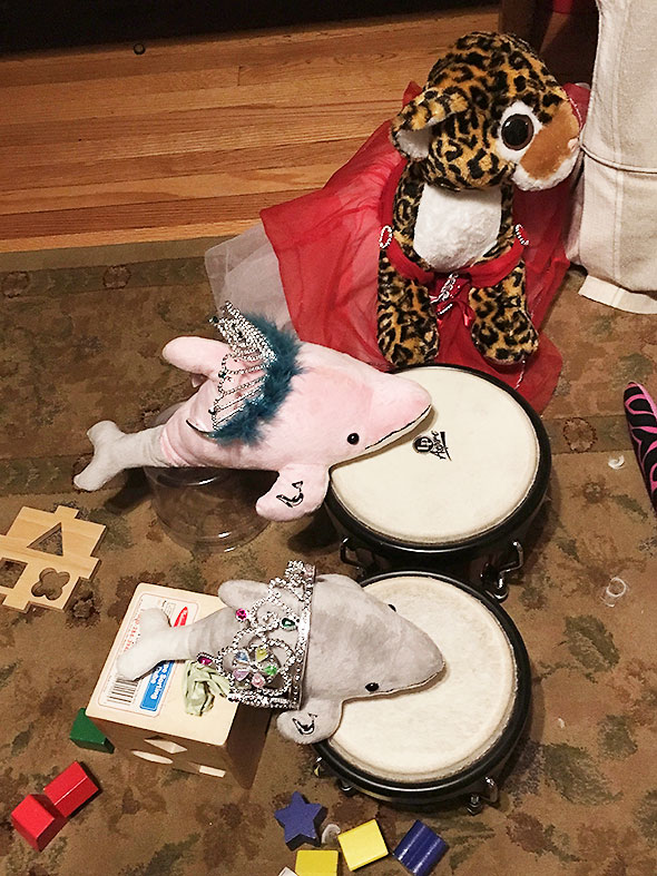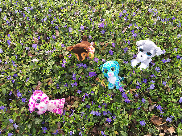The trees around our survived yesterday’s storm. We breathed a sigh of relief as both my husband and I had unfortunate accidents with our electronics over spring break. While mixing my first Bloody Mary, the shaker flew out of my hand and crashed onto the kitchen counter. Or rather my cell phone that was sitting on the kitchen counter. My son reacted first shouting, “Your phone! Your phone!” The phone survived its dousing of tomato juice but its screen caught the full blow of the metal shaker at its home button. Around the same time, my husband spilled a small amount of liquid over his computer as it was tipped on its side. He was watch a video on the computer a short time later when computer suddenly announced that it was shutting down. A trip to the Apple Store at the green was in order. When we interrupted the children’s play on Friday, they quickly revised their class schedules. Soon we were loaded up for an impromptu field trip: the children with no fewer 37 stuff animals from the Toy Green School.