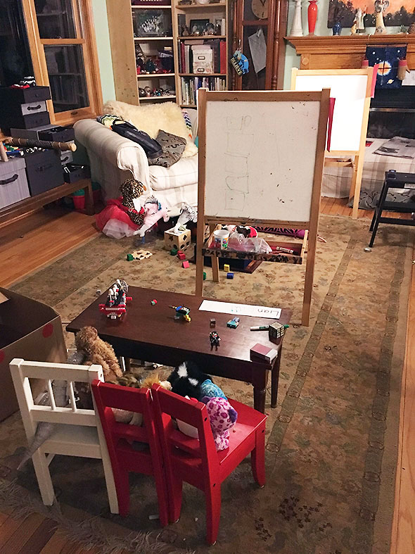 Once the storm blasted itself out, my husband took a turn around the property to look up and check for damage. The children resumed their play upstairs. In the last days of spring break, they arranged the living room into two classrooms. Their stuffed toys were invited to attend as students. Our son taught the younger group—kindergarden and first grade. He organized their schedule neatly: morning meeting, naptime, lunch time, playtime, and going-home time. He fit a math lesson in there also. Our daughter taught the older group—second through fourth grade. She spent time getting to know her students and making sure they were comfortable and that each one knew how to spell their names. The rules of the school were in dispute. Guns were allowed in the younger group but not in the older group. The younger group banded Giants finding them too scary at first. The students and their teacher debated the anti-Giant policy however and, once suitably armed, decided that the class decided they liked The BFG—Big, Friendly Giant—well enough to make an exception for him.