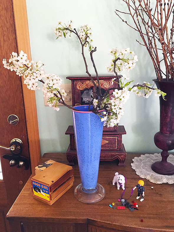 My husband received the blossoms with mixed feeling. Sure, they were beautiful but they were the pollen producing menace that was bringing on hay fever. He obliged my foolishness at bringing in the sworn enemy to sinus passages into the house. I was collecting vases when a second wave of weather crashed on the village. I watched the storm bend the three story high trees around the house at severe angles and children sent the children to the basement to play.