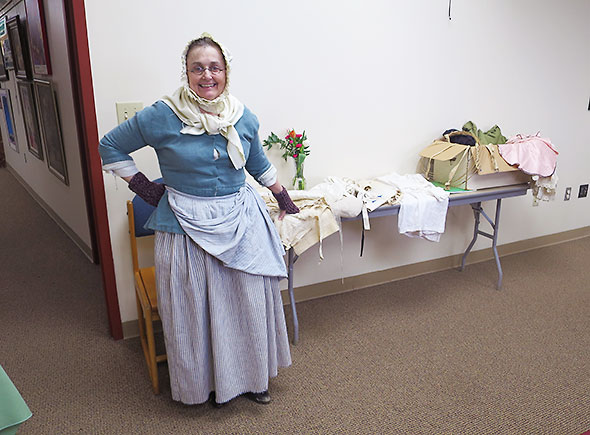 Collett engaged reenactor Ann Armstrong who presented a program on the underpinnings of 18th century dress. Wearing clothes from the 18th century, she passed around finely preserved linens that served as undergarments for the women of those times. She was just beginning to discuss the expense and care needed to maintain such garments when I reluctantly left the room to check on our three kettles of water. I found all of the kettles off. Not only off but unresponsive. Back in the 21st century, I had blown a fuse, perhaps two. While one librarian examined the library fuse box, another librarian helped me source out a more dispersed set of outlets to power our appliances. I had to sit next to one unit out near the magazine rack of the library, but soon we had several liters of piping hot water. We began steeping tea.