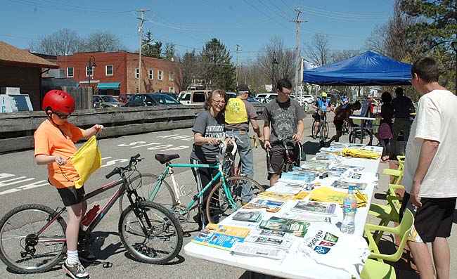 “Opening Day for Trails” drew crowds of cyclists and walkers last Saturday, the bluest of a blue string of spring days. Brian Housh, right, Midwest policy manager for Rails-to-Trails, staffed the information table in front of the Yellow Springs train station, where cyclists stopped for trail brochures, maps, faux “tattoos,” t-shirts and more.