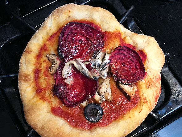 As far as toppings went, I wasn’t concerned about the adults in attendance but, since my own children were in attendance, I wondered what they would make of the available toppings. My daughter was all for the olives and shaved carrots but skeptical about the beets and mushrooms. My son was just the opposite. He loaded up his own pizza with mushrooms and was rather taken with the beets standing in for pepperoni. His interest was captured by the ceramic mandoline that I used to cut the beet rounds. Since he was intent on cutting his own “pepperoni”, I supervised him as he passed a beet root across the blade a couple of times.