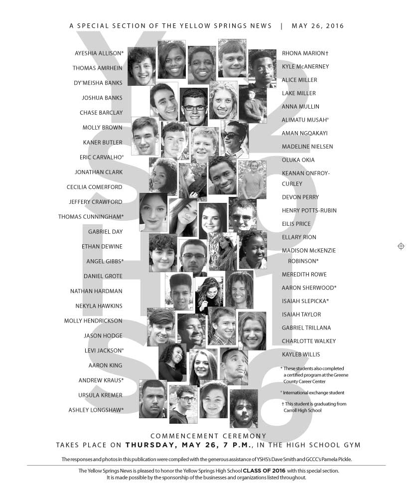 On Thursday, May 26, many years of hard work came to a close as the class of 2016 received their diplomas and celebrate with family and friends. Each year, the News publishes a special section of the paper dedicated to graduating seniors. Click below to read who’s graduating this year, what they think of Yellow Springs and what their plans are for the future in this special senior supplement. If you would prefer to read a hard copy, it’s still available on newsstands with this week’s paper, or you can stop by the News office and grab a copy for free.
