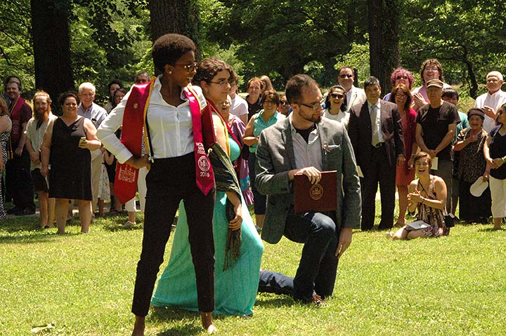 The weather was perfect, if a little warm, for the 50 members of Antioch College’s Class of 2016 to celebrate their commencement with friends, family and each other Saturday, June 18. Newly minted graduates took turns crossing ‘the Mound’ — an old Antioch ritual made possible this year by the clement weather — in their own unique ways. The World House Choir under the direction of Catherine Roma provided a rich musical texture, singing songs of struggle and hope. The commencement address was given by alumna of the college and chair of the Antioch College Board of Trustees Frances Degen Horowitz ’54. The college also celebrated the retirement of longtime staff member Anna Hogarty. Follow this link to read an interview with her.