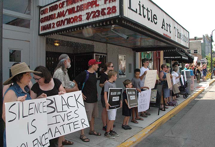 More than 150 villagers lined Xenia Avenue for an hour beginning at noon last Sunday in silent protest against recent shootings of blacks. Among those attending the vigil were, from left, Terry Graham, Dhyana Graham and Douglas Klappich, all of Yellow Springs.