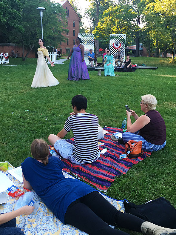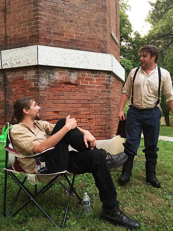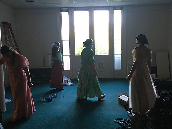 Our stage manager calls us to places, and I take in the details that actors have added. Ribbon trims, bonnet flowers, crinoline shrugs, gold strips, and ivory lace. I think too of the Antioch Hall, its beautiful brick facade, its white marble steps, tiled columns, and heavy hard wood office doors. My heart breaks a little for this grand hall, once jilted, now reawakened to host one of her signature summer events. I walk to the nook where I wait my next cue…the love song of Rowe and Wright…that welcomes our audience to the world we have built. One of my lines pops into my head…