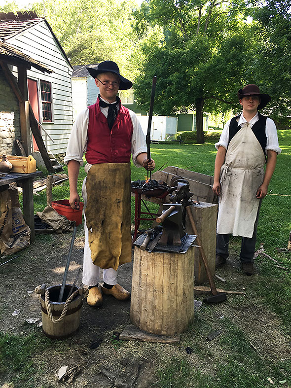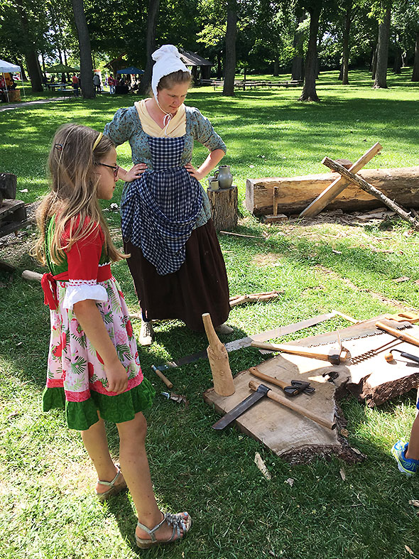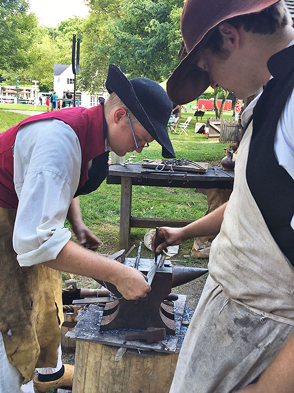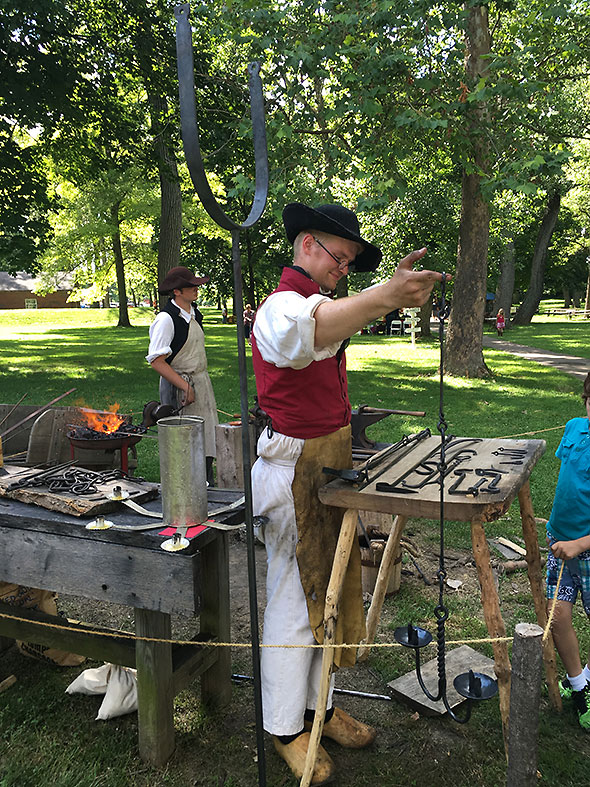The smithies dressed in period clothes from the early to mid 19th century: white shirt, vest, long pants, apron, and wide brimmed hat. In the small footprint of their demonstration, they had splayed an impressive collection of tools and wrought iron creations forged over the course of the day. The two smithies described the candle chandelier that, at that moment, they were forging piece by piece: the arms, the central shaft, chain, the four cups that would hold the candles. As I watched them work with care—measuring more than once before making a circular punch through the center of an iron arms—my daughter tugged at my sleeve to coax me toward the house where the bees wax candles were being dipped. Along the path, carpentry tools were laid out…the kind that would have been used to build the wooden home and tavern…and we witnessed a small child drilling a perfect one inch hole through a inch thick round of wood as his father looked proudly on.