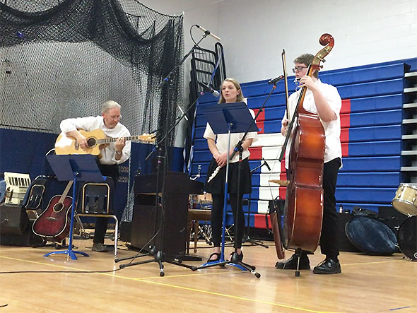 At the French Cafe, Sparrow-Knapp found further inspiration when high schoolers Bear Wright and Meredith Rowe took stage to sing a duet. French teacher Dave Smith accompanied them on guitar as Wright played bass. In the interludes, Rowe and Wright traded flute and harmonica solos. The sweet tune was haunting, and Sparrow-Knapp was particularly struck by their stage presence. Just as I approached her, she approached Rowe and Wright and asked them to consider participating in the summer play. Not wanting to over fill their already crowded dance card, they begged off a speaking part but encouraged Sparrow-Knapp to keep them in mind for music.
