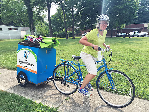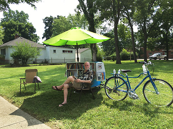 Our shade was provided by the big green umbrella of the bike bookmobile. I had seen the Greene County Public Library’s book bike in action before when I rode along side of Connie Collett in the 4th of July parade. Collett—the head library at the Yellow Springs branch—pedaled the mobile’s electric blue bike down Xenia Avenue on Independence Day while I handed out stickers and lollipops with the GCPL logo. Behind her, she towed a trailer outfitted with shelves and free books. Made mostly of wood, the trailer is heavy enough that Collett wove back and forth along the parade route to keep the bookmobile’s momentum under control.