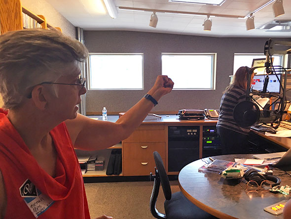 The kids took their ride on the firetruck and headed back home. I stuck around the bookmobile’s stacks a little longer until the firetruck took its last run. Collett stopped by to ask how the afternoon had gone and announced her intention to take a tour of WYSO. I jumped on that train and we arrived in time to match up with non other than General Manager Neelah Ellis. She walked us through the studios where Niki Dakota was hosting a live performance on air and Steve McQueen was recording testimonies from open house visitors.