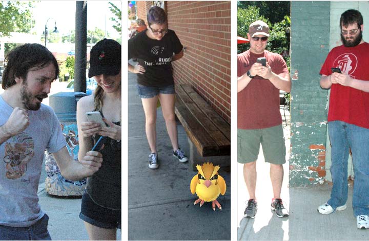 Luke Roburn and Leah Cultice of Beavercreek were hot on the trail of a Pokémon; a screenshot from Antioch student Claire “Connie” Brunson’s phone, outside of Tom’s, with “Pidgie”; brothers Chris and Cody Sackett, from Troy, outside the Emporium. (Photos by Dylan Taylor-lehman, except center, submitted)