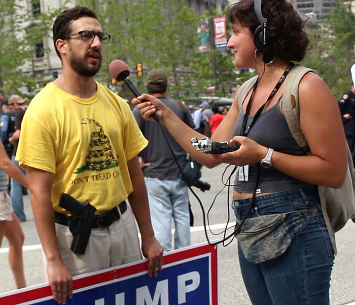 Antioch College student Lillian Burke interviewed an open carry activist at last week’s Republican National Convention in Cleveland. Burke and a number of fellow students went to the convention, where they spoke with activists and attendees of all stripes as part of Professor Charles Fairbanks’ media arts class. (Submitted photo)