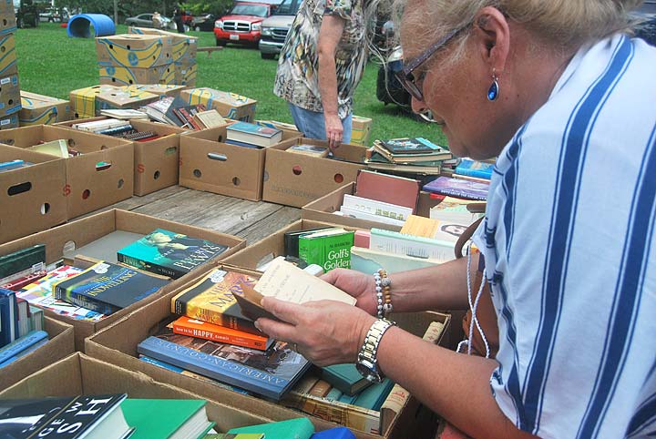 According to Kate Mooneyham, manager of Dark Star Books, over 1,000 people streamed onto the Mills Lawn School front lawn Saturday, Aug. 20, to peruse the printwares of dozens of booksellers, local and from around the Miami Valley. The fair, organized by Dark Star Books, was a success in spite of rain cutting in towards the afternoon.