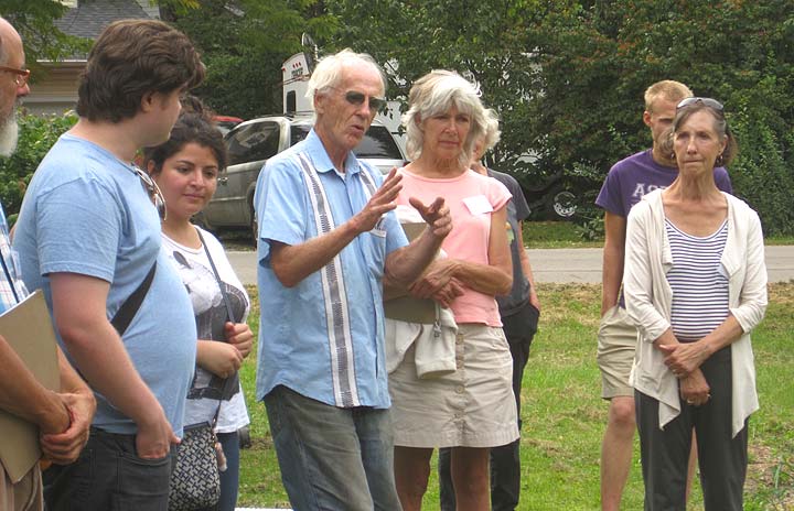 Last fall about 50 people toured the High Street garden of Al Schlueter, shown above gesturing during the tour. A second tour of Schlueter’s garden, along with those of Macy Reynolds and the Antioch Farm, takes place this Sunday, Aug. 14, beginning at 10:30 a.m. in the parking lot behind the Wellness Center. (Submitted photo)