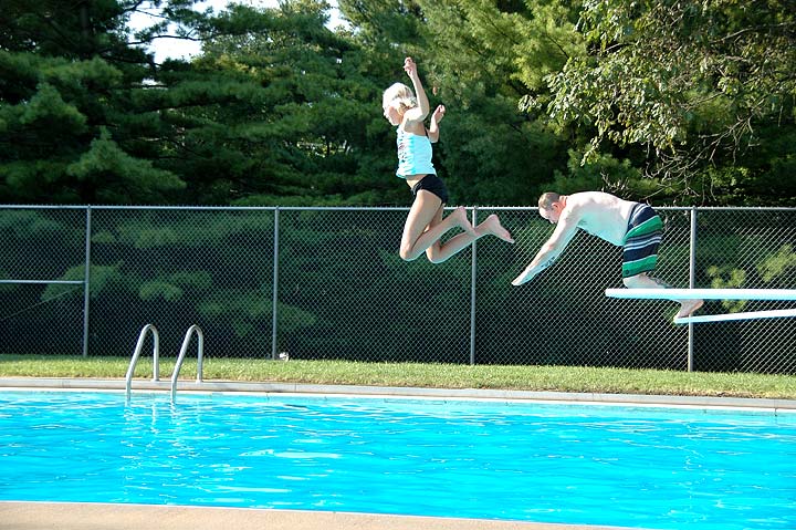 The prosepect of hitting the water after a flying leap was made more attractive by the promise of a cool splash, as local Siobhan and her uncle Christian, visiting from Jamestown, saltoed through the summer air at Gaunt Park Pool last Friday. (Photo by Isaac Delamatre)