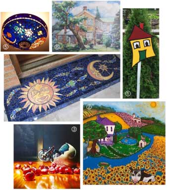 The annual Art Hop, organized by the Yellow Springs Arts Council, gives the public a chance to view art in the context of a home, rather than a gallery. 1) The Hopping house logo signs were designed and painted by Kathleen Verner Moulton. Other art includes works by 2) Nancy Mellon, 3) Jason Morgan, 4) Lisa Wolters, 5) Valerie Spinning and 6) Walter Steinhilber. (submitted photos)