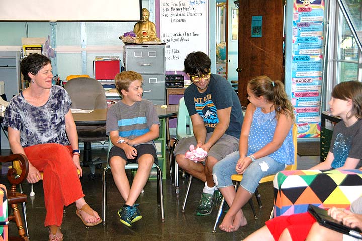 Everyone has a turn to talk and share during the daily morning meeting of the Antioch School’s Older Group. The OG has a new teacher, Sally Dennis (far left), and teaching assistant, Matt Moon (third from left) this year. Student Luka Sage-Frabotta sits between them during Tuesday's meeting time; classmates Mia Florkey and Luca Acheson sit to the right. (Photo by Carol Simmons)