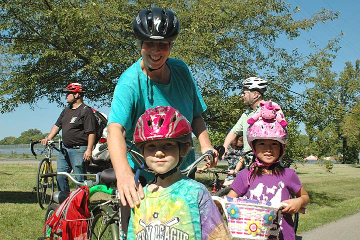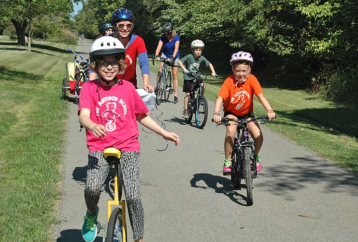 More than 30 riders took off under blue skies and a hot sun last Sunday for the Antioch School’s annual “Anything on Wheels” fundraiser. Riders — including Antioch school student Lucy Dennis (on unicyle), Older Group teacher Sally Dennis and students Elijah Moon and Ayla Current — pedaled down the Little Miami Scenic Trail for all or part of a 15-mile round-trip route to the northern edge of Xenia. (Photo by Audrey Hackett)