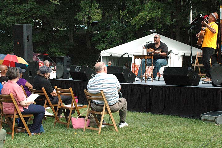 The weekend of Sept. 9–11 was packed to the village’s proverbial rafters with happenings. above: Dark skies and threats of thunderstorms didn’t keep villagers from celebrating the life of longtime AACW activist Faith Patterson last Saturday afternoon, at the opening event of the AACW Blues Fest. Below: Antioch President Tom Manley delivered a “State of the College” address last weekend in the South Gym to several hundred Antiochians as part of Alumni Reunion last weekend.