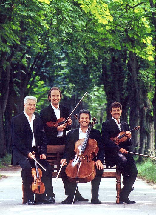 The four musicians of the Auryn Quartet — Matthias Lingenfelder and Jens Oppermann on violin, Stewart Eaton on viola, and Andreas Arndt on cello — play on wonderful Italian instruments: a Stradivarius violin (1722, ex-Joachim), a Petrus Guarneri violin, a Brothers Amati viola (1616) and a Niccolo Amati cello.
