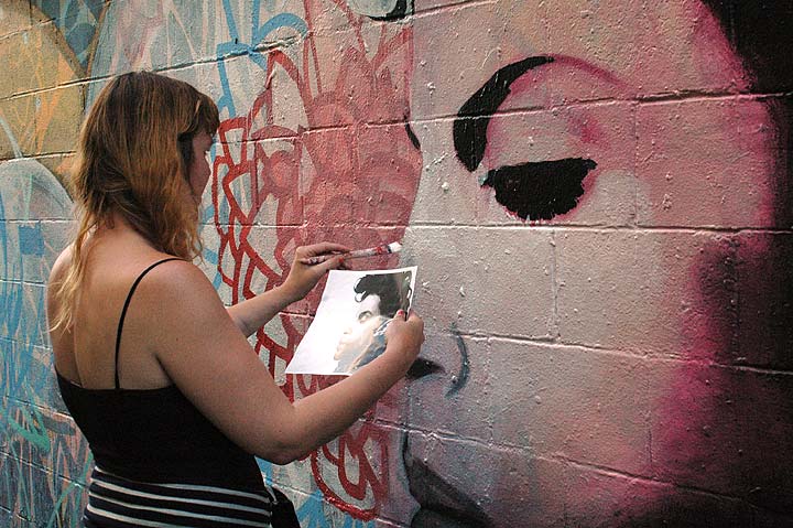 BOTTOM PHOTOS: Muralists Sarah Dickens and Pierre Nagley conversed while she fleshed out her rendering of legendary pop/funk/rock musician Prince. Nagley continued work on the southern part of the wall, completing an abstract study in yellows and oranges with white swirls. The two are mapping out a series of small movies that use dark humor to explore the challenges of living as an artist.
