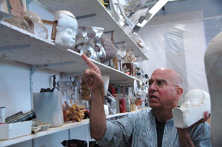 Lapedes makes large sculptures and occupies a substantial warehouse space near the Yellow Springs Brewery to do so. The scope of his work underscores the reasons why an artist may need a studio and not just a spare room in the house. The roughly 40-by-60-foot space is filled with well-organized shelves and tables, woodworking tools and coils of barbed wire, piles of scrap and a heated tub with 100 pounds of skin wax inside. There is a sealed room for painting and another sealed room for working with cement, a material that figures prominently in his works. Distended forms of plastic with molded faces on the end leer out from shelves like stationary ghosts.